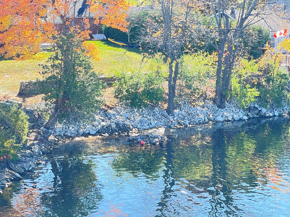 Canning Greenworks Studio secured federal and conservation authority permitting, designed and supervised installation of a naturalistic shoreline using a variety of stone sizes for aesthetics and protection from boat wakes.